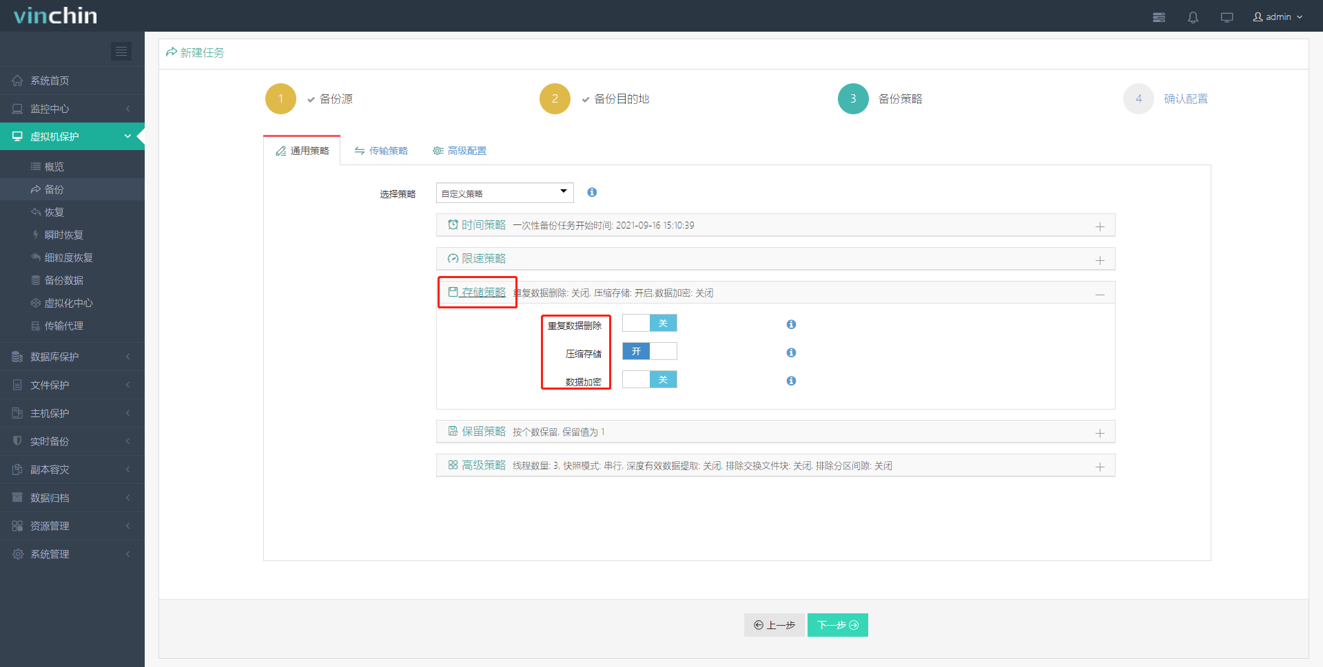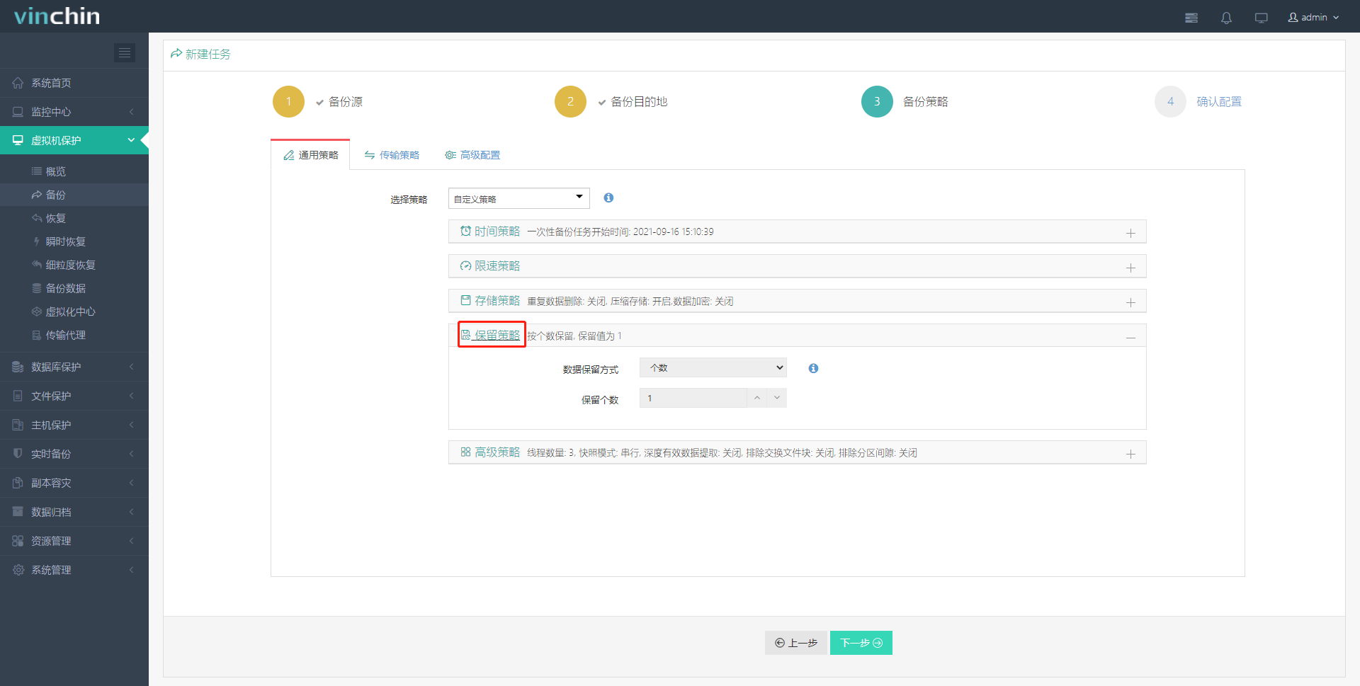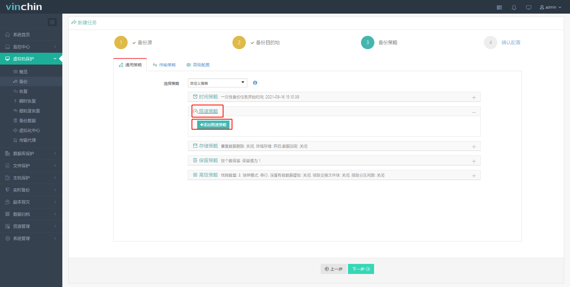 5、对备份任务进行其他配置,选择【限速策略】、【存储策略】、【保留策略】、【高级策略】