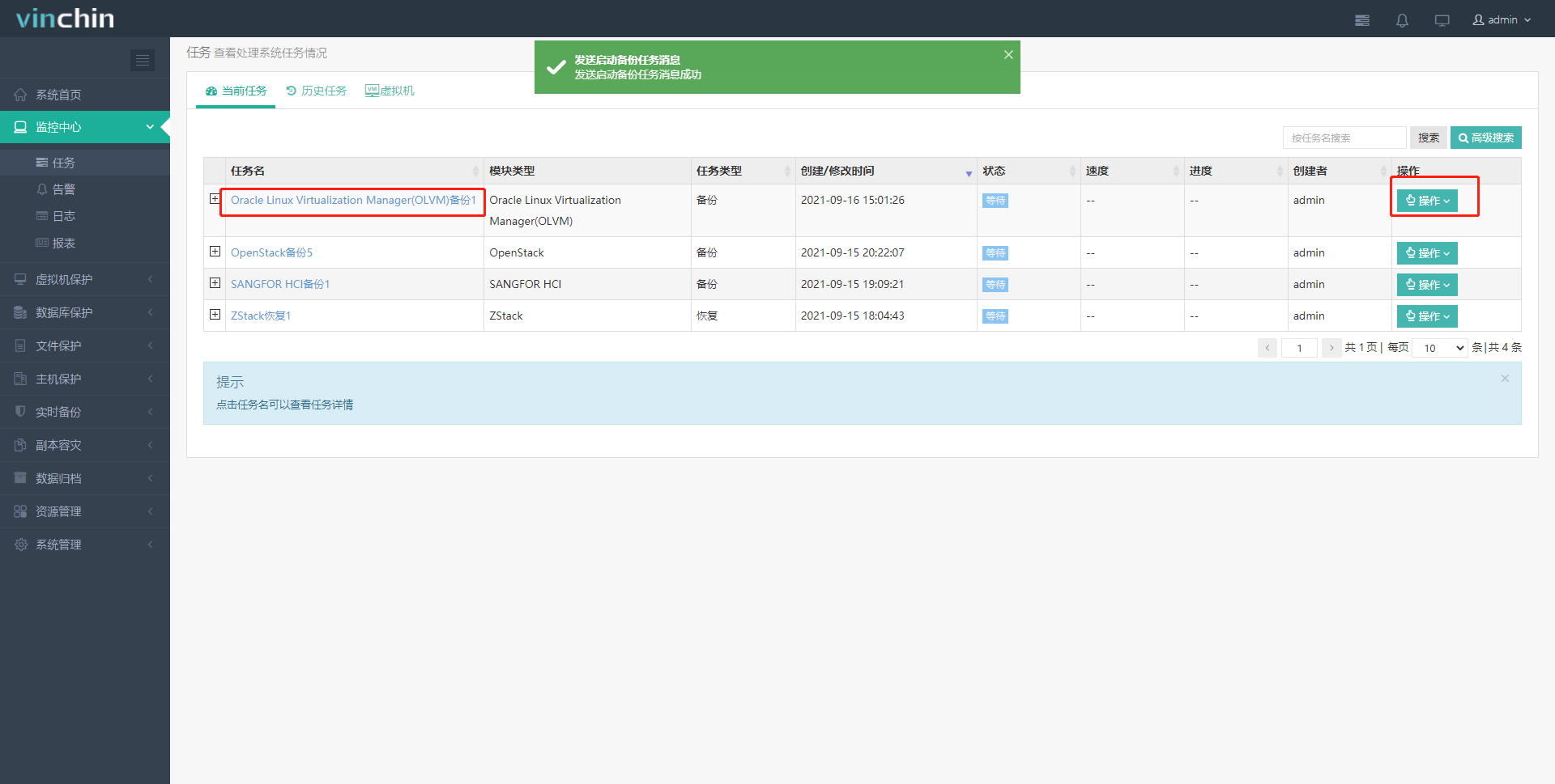 9、提交任务后自动跳转到【当前任务】页面,可以查看刚才创建的备份任务。点击右侧的“操作”按钮可以手动运行或停止任务,也可以等待系统按照设定的策略自动执行备份任务。点击任务名称,可以进入【任务详情】页面。