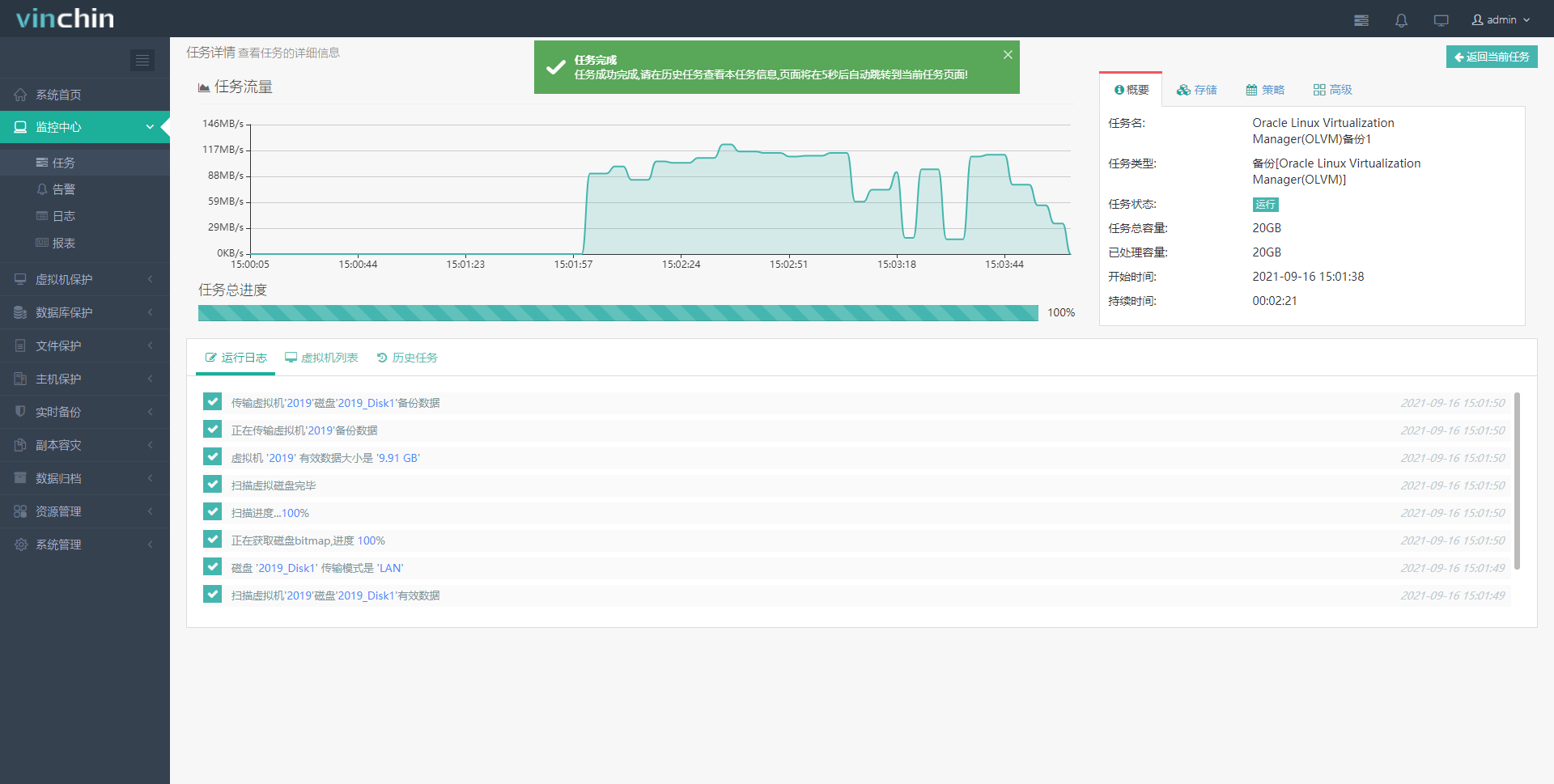 10、在【任务详情】页面左上方显示任务运行时数据传输的流量速度,右上方显示任务的配置信息,下面显示备份任务的运行日志、虚拟机列表和历史任务。