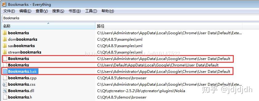 可以看到在我的电脑里面 C:/User/Administrator/AppData/Local/Google/Chrome/User Data/Default/ 目录下有一个 Bookmarks 与一个 Bookmarks.bak 文件。