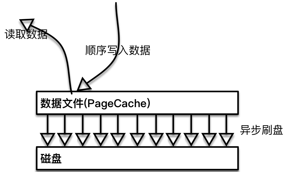 Page Cache是文件的缓存,用于加速对文件的读写,它为RocketMQ提供了更强大的堆积能力。RocketMQ将数据文件映射到内存中,写消息的时候首先写入Page Cache,并通过异步刷盘的模式将消息持久化(同时也支持同步刷盘),消息可以直接从Page Cache中读取,这也是业界分布式存储产品通常采用的模式,如下图所示: