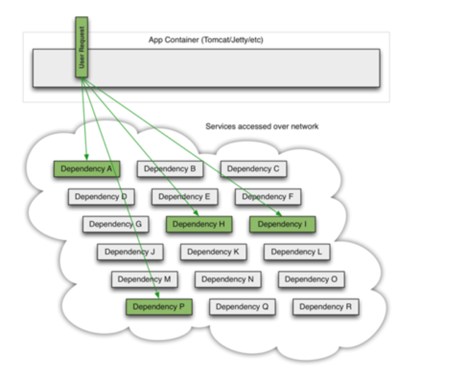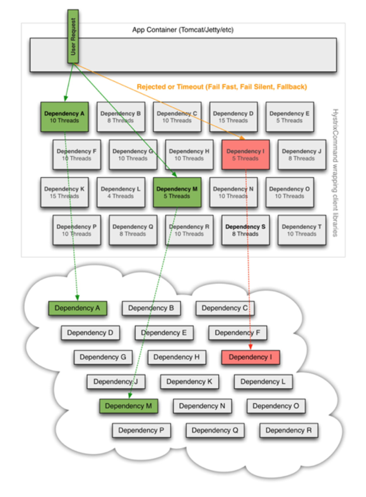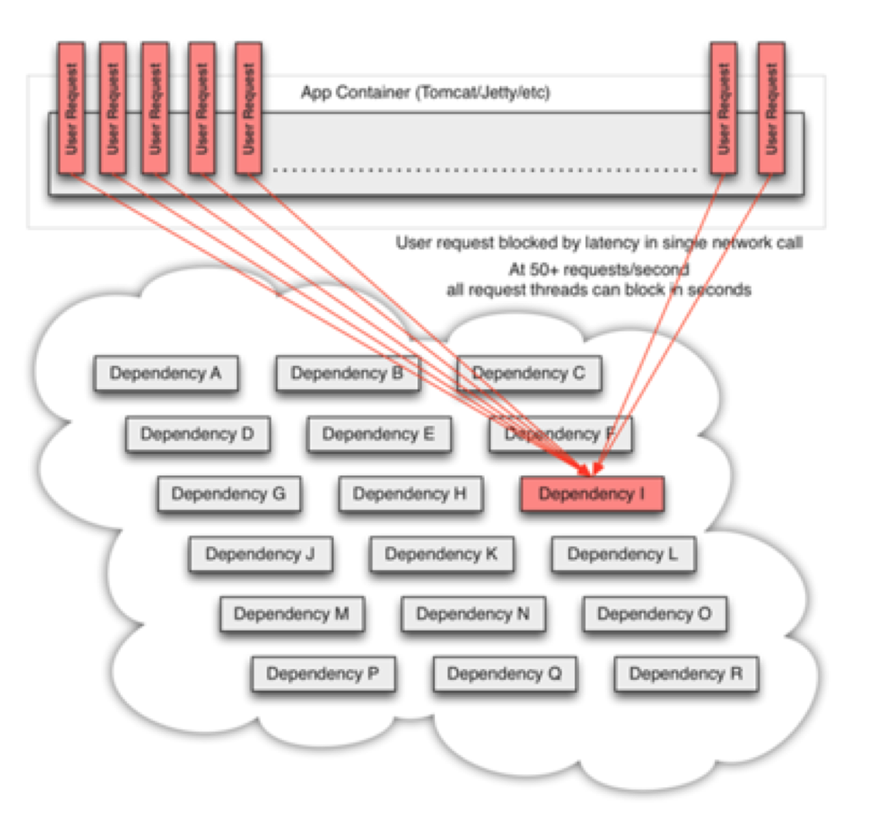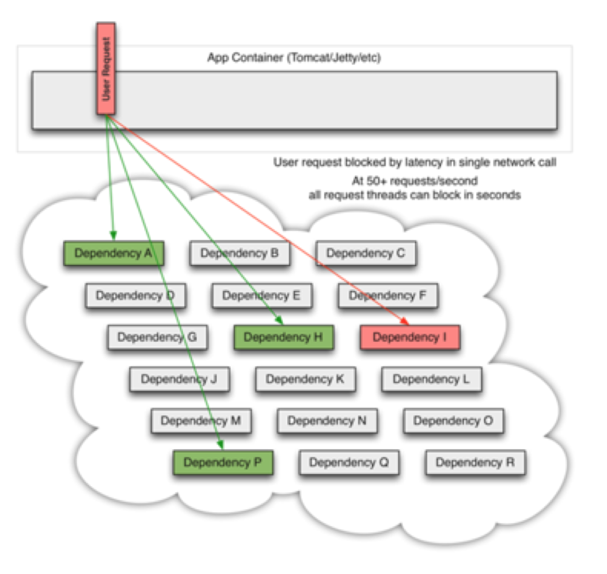 上述三幅图,描述了系统从初始的健康状态到高并发场景下阻塞在下游的某个关键依赖组件的场景。这种情况很容易诱发雪崩效应。而通过引入Hystrix的熔断机制,让应用快速失败,继而能够避免最坏情况的发生。