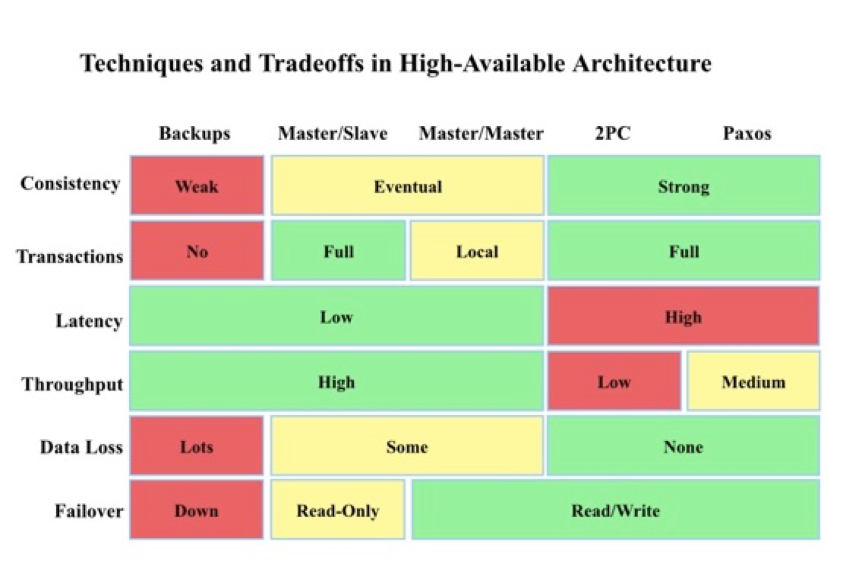 其中,行代表了分布式系统中通用的高可用解决方案,包括冷备、Master/Slave、Master/Master、两阶段提交以及基于Paxos算法的解决方案;列代表了分布式系统所关心的各项指标,包括数据一致性、事务支持程度、数据延迟、系统吞吐量、数据丢失可能性、故障自动恢复方式。