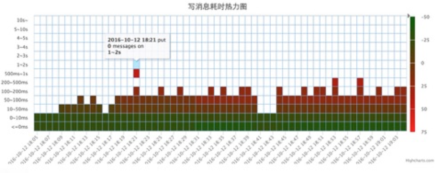 RocketMQ通过对上述情况的优化,成功消除了写消息高延迟的情形,并通过了今年双11的考验。优化后写消息耗时热力图如下图所示。