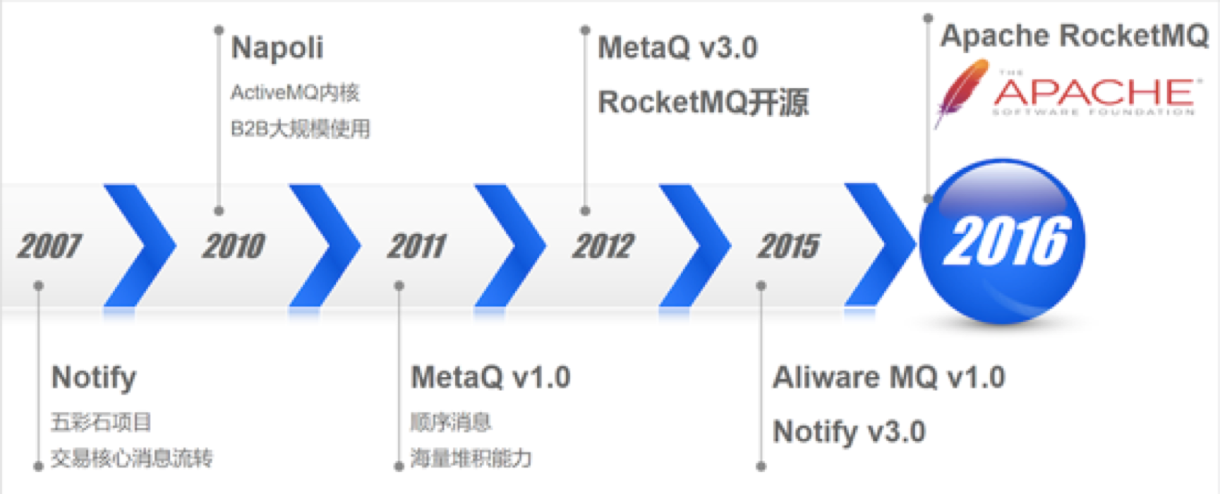 阿里中间件消息引擎发展到今日,前前后后经历了三代演进。第一代,推模式,数据存储采用关系型数据库。在这种模式下,消息具有很低的延迟特性,尤其在阿里淘宝这种高频交易场景中,具有非常广泛地应用。第二代,拉模式,自研的专有消息存储。能够媲美Kafka的吞吐性能,但考虑到淘宝的应用场景,尤其是其交易链路等高可靠场景,消息引擎并没有一位的追求吞吐,而是将稳定可靠放在首位。因为采用了长连接拉模式,在消息的实时方面丝毫不逊推模式。在前两代经历了数年线上堪比工况的洗礼后,中间件团队于2011年研发了以拉模式为主,兼有推模式的高性能、低延迟消息引擎RocketMQ。并在2012年进行了开源,经历了6年双11核心交易链路检验,愈久弥坚。目前已经捐赠给阿帕奇基金会(ASF),有望成为继ActiveMQ,Kafka之后,Apache社区第三个重量级分布式消息引擎。时至今日,RocketMQ很好的服务了阿里集团大大小小上千个应用,在双11当天,更有不可思议的万亿级消息流转,为集团大中台的稳定发挥了举足轻重的作用。