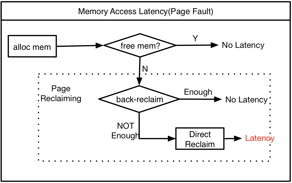 Linux会用尽可能多的内存来做缓存,大多数情形下,服务器可用内存都较少。可用内存较少时,应用程序申请或者访问新的内存页会引发内存回收,当后台内存回收的速度不及分配内存的速度时,会进入直接回收(Direct Reclaim),应用程序会自旋等待内存回收完毕,产生巨大的延迟,如下图所示。