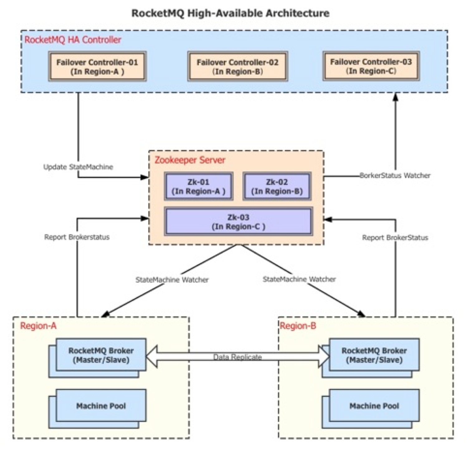 其中,Zookeeper作为分布式调度框架,需要至少在A、B、C三个机房部署以保证其高可用,并为RocketMQ高可用架构提供如下功能:
