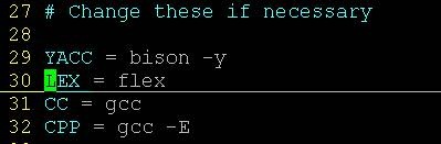 修改YACC和LEX的内容如图所示(原内容YACC = yacc, LEX = lex),如果你的系统上没有安装bison和flex那么先安装这两个程序,这是进行语法检查的程序,ubuntu上面由原来的yacc和lex改为了bison和flex,有些朋友使用: