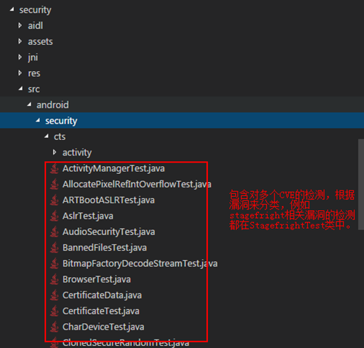 CtsSecurityTestCases模块基于动态检测,采用的是触发漏洞来检测的方式,使用Java或者JNI来触发漏洞,直到数据被传递到底层漏洞位置。这个模块所在源码的路径是.test/test/security。