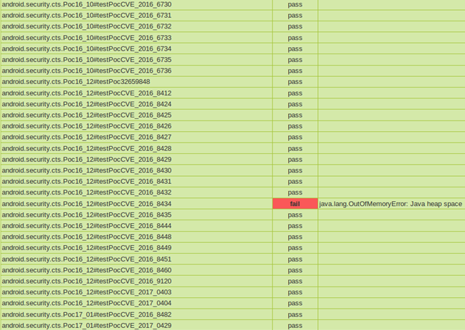 可以通过run cts --module CtsSecurityHostTestCases来测试整个模块,也可以通过run cts --module CtsSecurityHostTestCases –test 来测试具体的方法。例如要测试CVE_2016_8451,可以通过--test android.security.cts.Poc16_12#testPocCVE_2016_8451来进行。