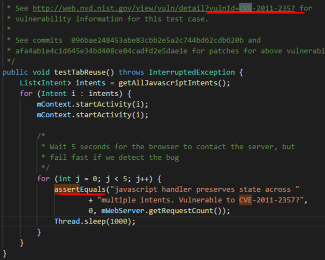 对测试结果的监控都是通过assertXXX()方法来进行的,通过测试过程中的行为来确定漏洞情况。例如: