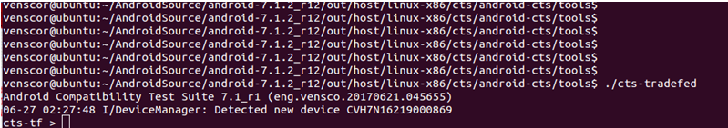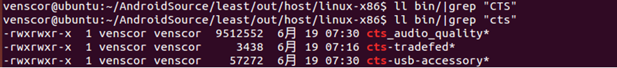 通过git clone https://android.googlesource.com/platform/cts -b xxxxxxx 可以下载cts并且进行编译,或者可以下载完整的Android源码进行编译,编译好源码之后再编译CTS,命令是make cts;在/home/venscor/AndroidSource/least/out/host/linux-x86/cts下生成关于CTS的几个文件,其中cts-tradefed可以启动CTS测试程序。