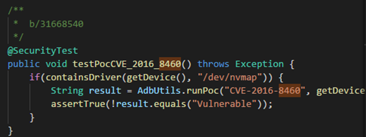 对于CtsSecurityHostTestCases模块中现有的对漏洞的检测代码,也可以直接为我们所用。我们可以下载CTS的源码查看漏洞检测PoC的代码,可以自己编译也可以直接使用CTS编译好的可执行文件来检测对应的漏洞。