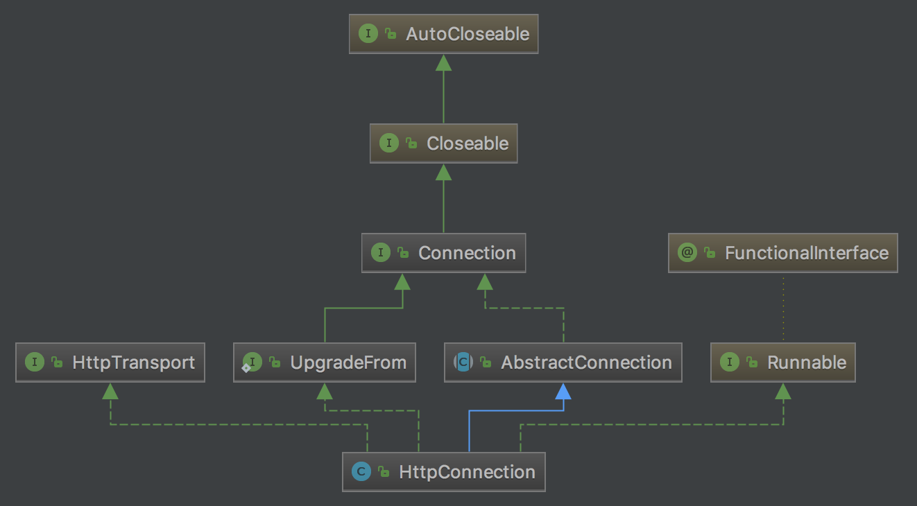 HttpConnection实现了HttpTransport接口,HttpTransport主要是用户反向传输,即响应时使用;同时实现了UpgradeFrom,主要实现当协议切换时的操作;还实现了Runnable,表示可以被运行,继承了AbstractConnection