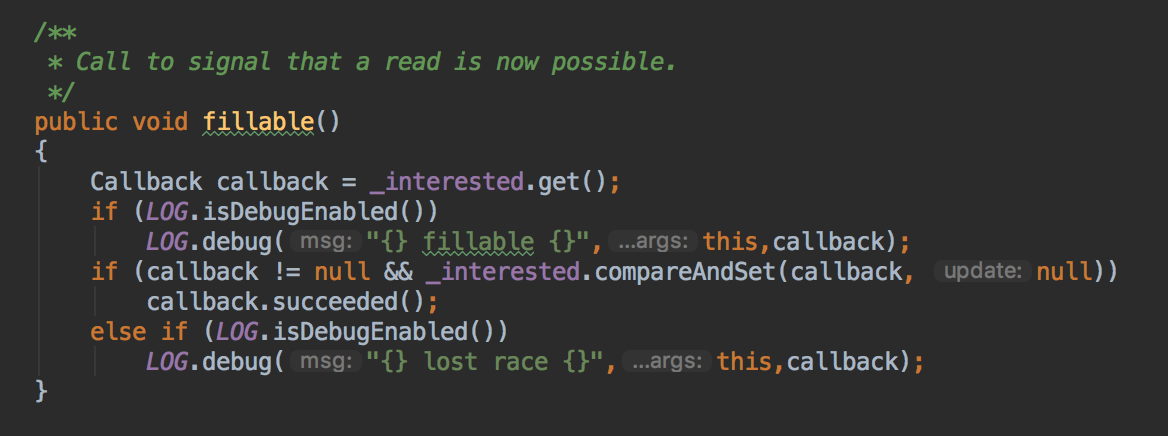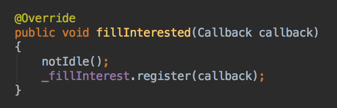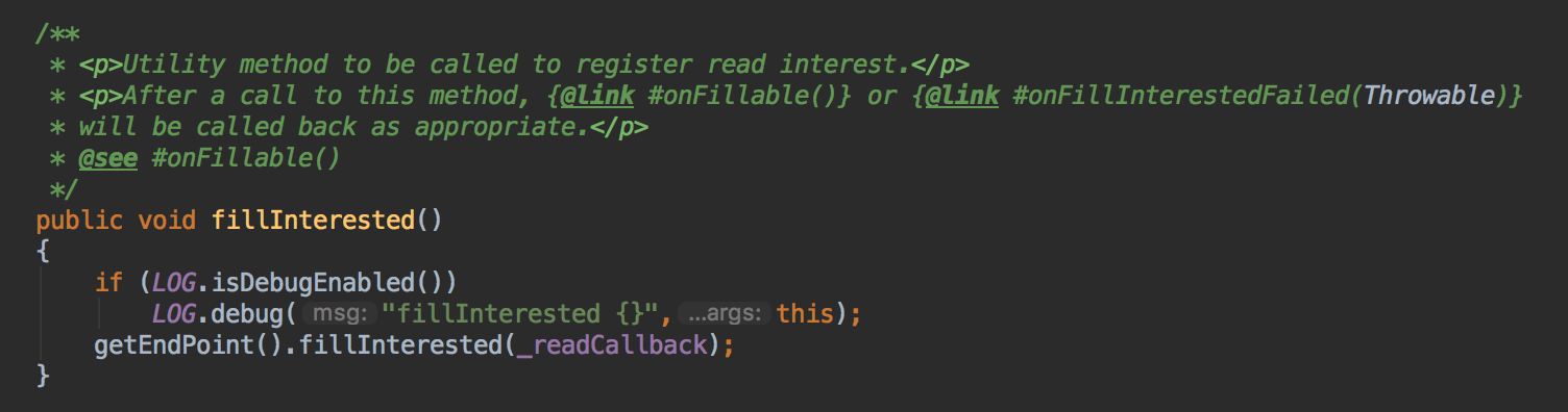 这里仍然是AbstractConnection的方法,前面提到的ReadCallback会注册到EndPoint上面,如下图,是AbstractEndPoint的方法,将这个callback设置到fillInterest上面