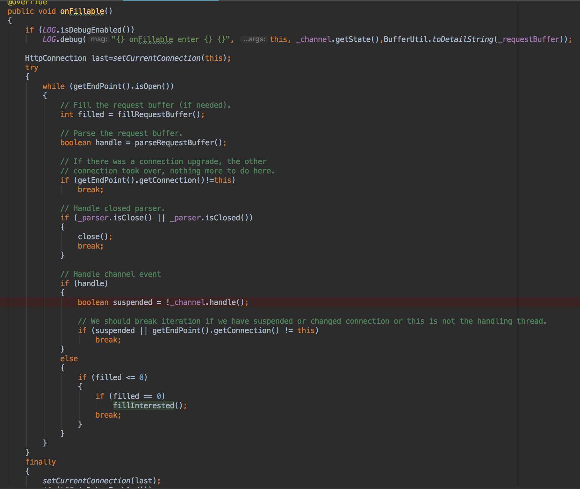 另外还有一点如果读取数据量filled为0,并且这时handle为false,其实就是说当前数据包不完整,需要继续读,就会调用fillInterested,继续向Channel注册OP_READ,因为之前我们曾经在SelectChannelEndPoint的onSelected方法提到过,当事件发生后,会取消这个Channel的事件监听,因此这里需要重新注册回去,保证后续的读仍然能正常进行