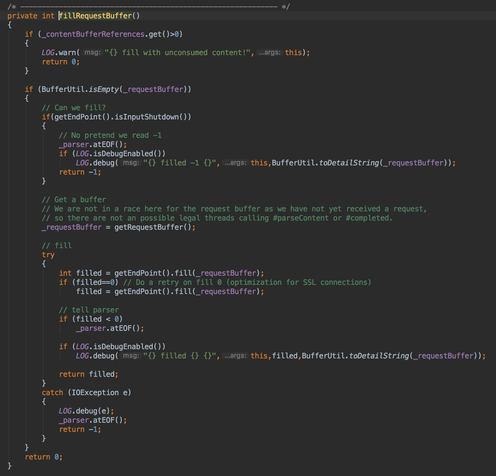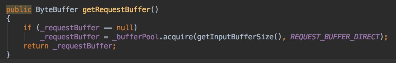 下图中,获取Buffer也比较简单,从ByteBufferPool申请一个,注意第二个参数,REQUEST_BUFFER_DIRECT,默认是false,也就是默认对于请求缓冲并不是走Direct Buffer,如果对于大量的数据传输,例如文件这样的服务器,建议是配置这个为true,走Direct Buffer毕竟可以少1次不必要的堆外到堆内的一次数据拷贝
