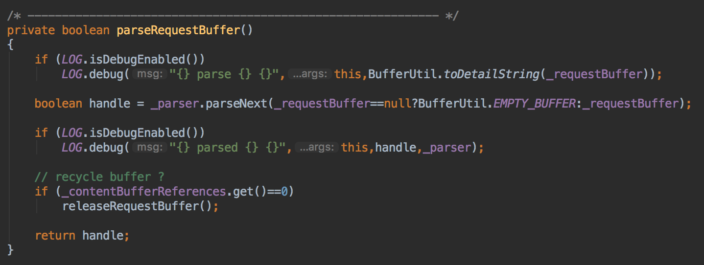解析就是利用HttpParser的parseNext方法来解析,后续将会在HttpParser章节讲解,这里略过。值得注意的是,这里如果这里缓冲的引用计数为0,会自动释放该缓冲内存