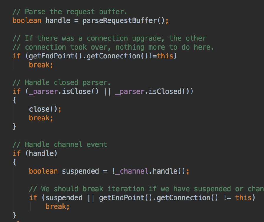 解析完成后,返回一个handle变量,表示后续是否可以进行处理了,其实HttpParser只要解析到请求头+请求行完毕时,就会认为当前这个请求可以处理了,就直接返回true,否则如果整个HTTP报文不完整,比如读到了半包这种情况,这里会返回false,会要求再继续向这个ByteBuffer里面读数据,直到没有数据或可以处理为止。如果可以处理,这里就会调用HttpChannelOverHttp的handle方法,交给Server以及后续和Server关联的Handler继续执行