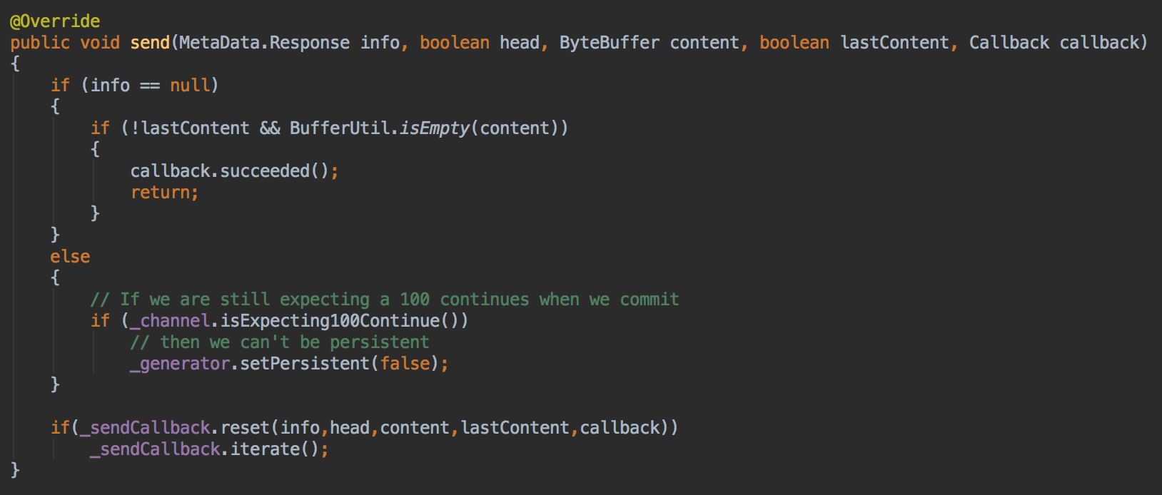这里可以看到利用了sendCallback来调用(sendCallback其实是一个IteratingCallback,这个是一个比较复杂的回调类,后续有专门的章节讲解),最终这个回调会调用到HttpConnection.SendCallback类的process方法,开始生成数据并发送,接下来我们就来分析