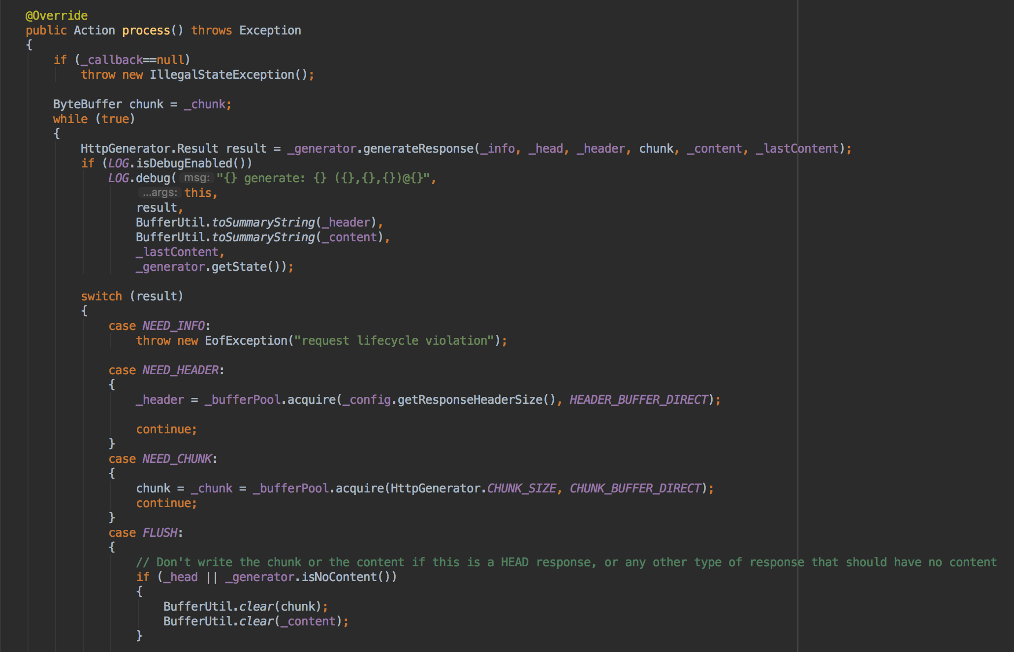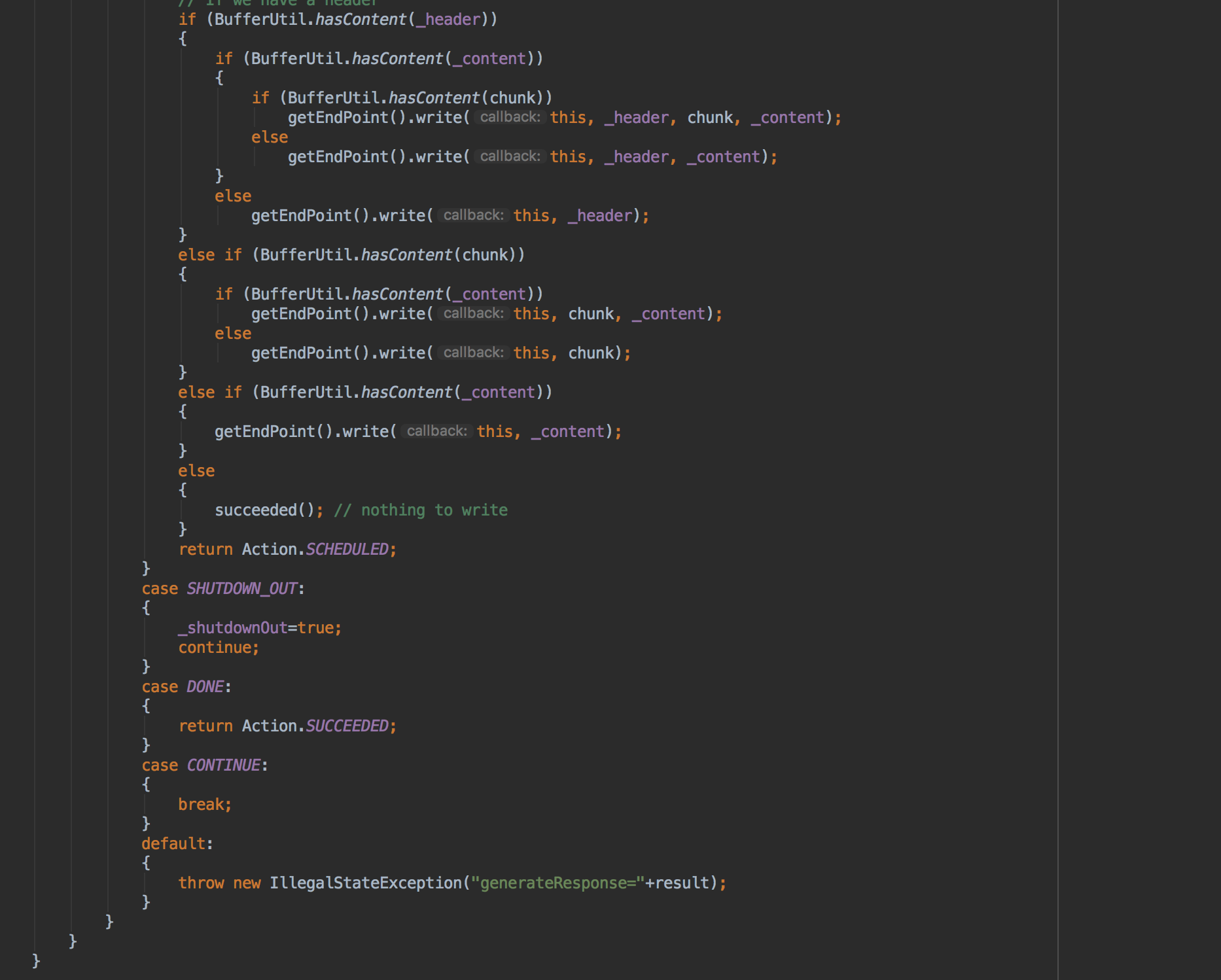 while循环第一行利用HttpGenerator完成响应行、响应头、响应体的生成,并返下一步要执行的操作,通常就是我们的FLUSH操作,FLUSH操作就会触发EndPoint的write方法,这样数据就落到了真实的传输层