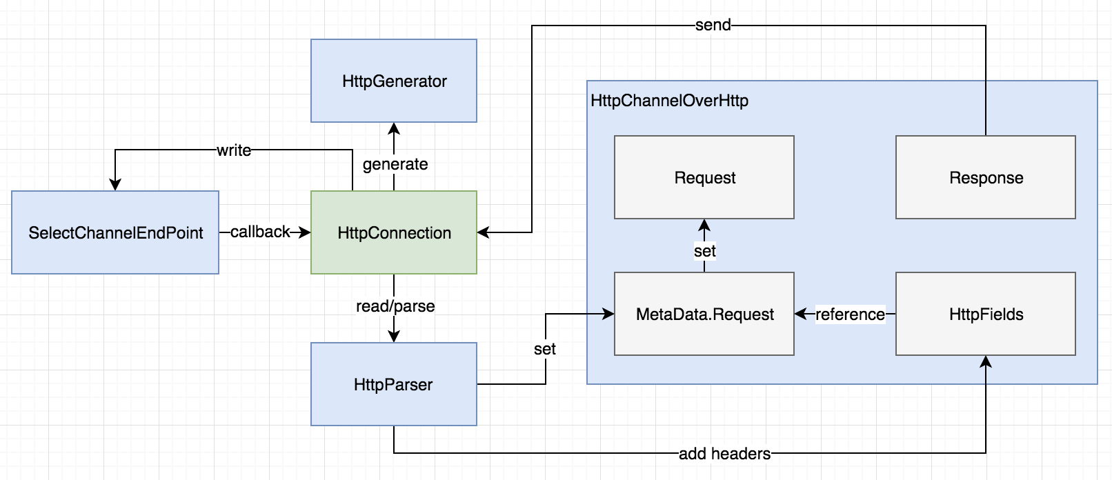 图中绿色表示我们要分析的HttpConnection,蓝色的表示内部协作其他组件,浅灰色的表示POJO对象(不过严格来说Request、Response不属于)