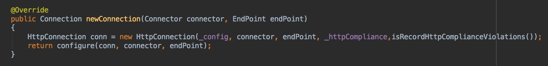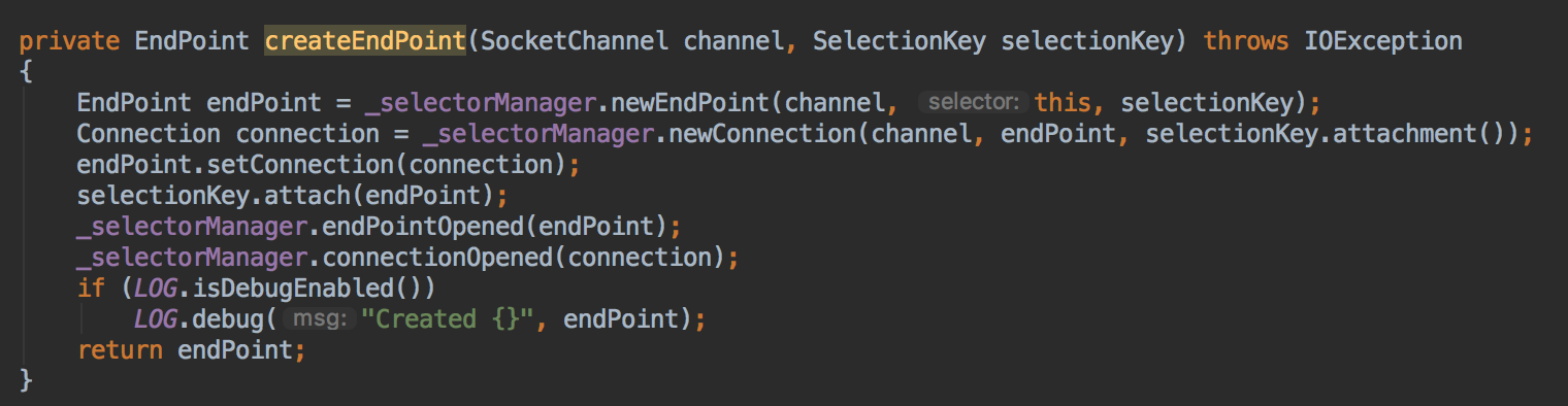 之前在ManagedSelector提到过,创建EndPoint的时候,会创建SelectChannelEndPoint,同时会创建HttpConnection,创建完成后会调用SelectorManager.connectionOpened,如下图
