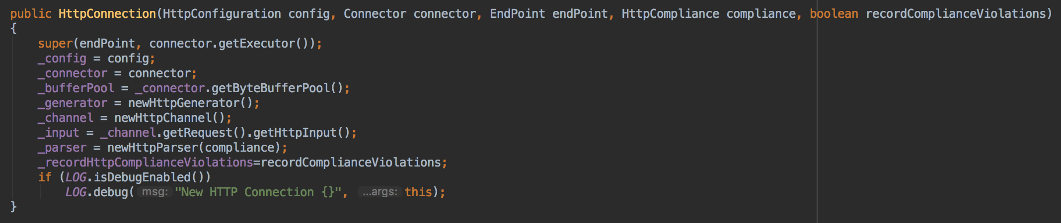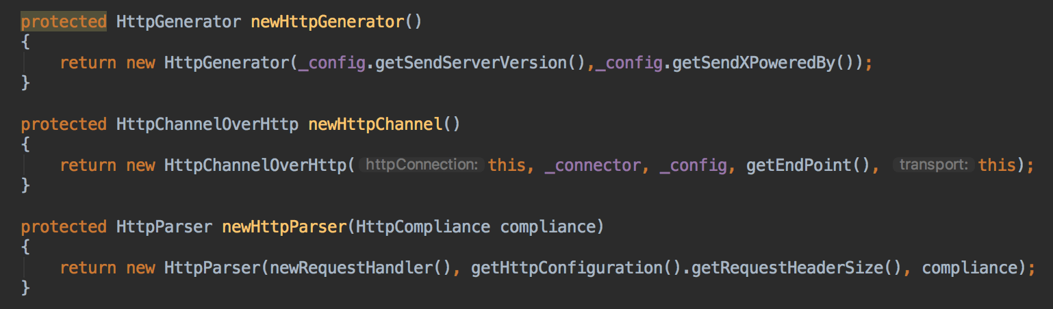 构造函数比较简洁,将这些关联的组件保存下来,这里可以看到,创建连接会创建HttpGenerator,HttpChannel,HttpParser,以及将HttpChannel关联的HttpInput拿到(HttpInput其实就是ServletInputStream,后续会在HttpInput章节讲解)