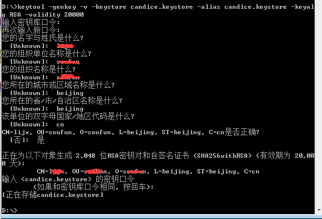 keytool -genkey -v -keystore candice.keystore -alias candice.keystore -keyalg RSA -validity 20000