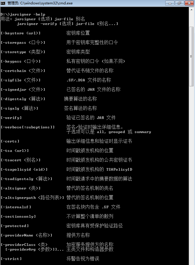 JDK版本不同,可能需要的参数不同,可以查看jarsigner 命令帮助