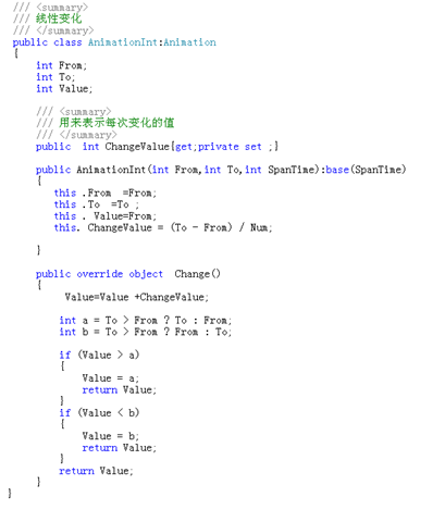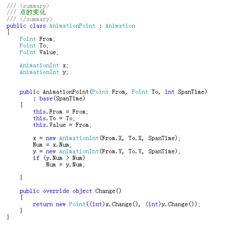 这样就简单的完成了一个模拟动画效果的类 :看看AnimationPoint类,只是用类两个AnimationInt类来实现的,当然也可以用三个来实现一个Color类。。。