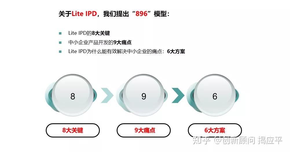 Lite IPD流程,我们提出了“896”模型。8是指Lite-IPD的8个关键点,9是指解决中小企业的9大痛点,6是指提出6大解决方案,如下图所示。