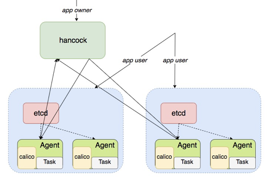 这两个虚线的框分别表示两个不同的节点,每个节点上数量不等的机器会组成一个小集群,每个机器上会部署一个 Agent, Agent 会负责创建各个 Docker 的 Task,容器服务的用户(App user ) 直接会去边缘节点访问容器服务。