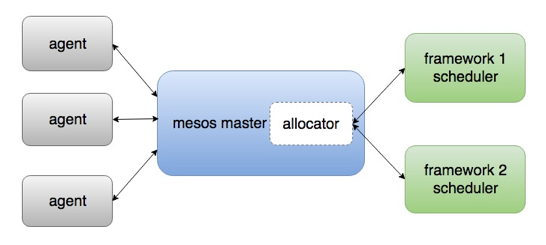 Mesos 调度平台相当于数据中心的 Master,同时在每个节点上都有一个 Agent。当每个Agent 启动后会向 Mesos 注册,Agent 携带的资源信息,让 Mesos 决定每个框架的资源数量。当框架收到资源后,再根据需求调度资源。