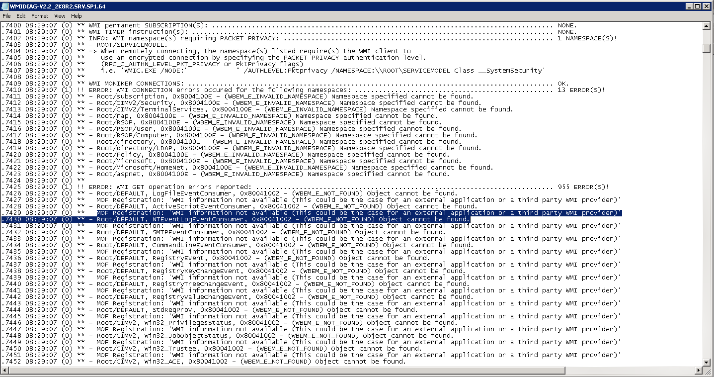 Once complete you will get a text file of the results. Here you should be able to narrow down the cause of your WMI issue. In my case there are issues with .MOF registrations.