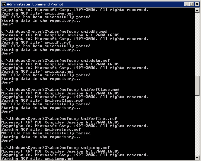 To resolve MOF Registration errors the following commands need to be ran from an elevated command prompt. It will reregister all .MOF files with WMI.