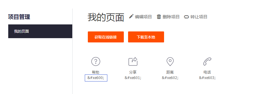 2.选择完所有要用的图标后“存储为项目”,给它命名。然后在“图标管理”-“图标应用项目”中找到这个项目,获取在线链接,把里面的代码复制到CSS中。