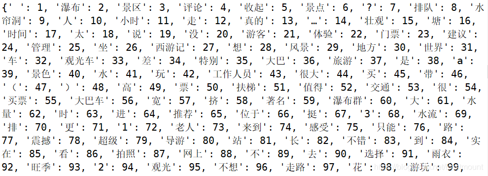 首先,我们先调用Tokenizer和fit_on_texts函数将文本中的每个词编号,词频出现越高其编号越小。如下图所示,“瀑布”、“景区”、“排队”、“水帘洞”等特征词出现较多,注意空格、“评论”、“收起”可以继续过滤掉,在停用词表中添加即可。