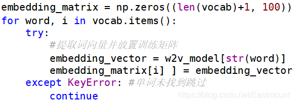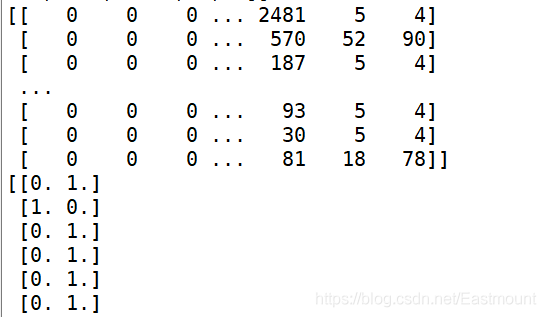 # 使用 train_test_split 分割 X y 列表 X_train, X_test, y_train, y_test = train_test_split(Mat, labels, test_size=0.3, random_state=1) print(X_train[:5]) print(y_train[:5]) #----------------------------------第三步 词向量构建-------------------------------- # Word2Vec训练 maxLen = 100 #词序列最大长度 num_features = 100 #设置词语向量维度 min_word_count = 3 #保证被考虑词语的最低频度 num_workers = 4 #设置并行化训练使用CPU计算核心数量 context = 4 #设置词语上下文窗口大小 # 设置模型 model = word2vec.Word2Vec(Mat, workers=num_workers, size=num_features, min_count=min_word_count,window=context) # 强制单位归一化 model.init_sims(replace=True) # 输入一个路径保存训练模型 其中./data/model目录事先存在 model.save("CNNw2vModel") model.wv.save_word2vec_format("CNNVector",binary=False) print(model) # 加载模型 如果word2vec已训练好直接用下面语句 w2v_model = word2vec.Word2Vec.load("CNNw2vModel") # 特征编号(不足的前面补0) trainID = tokenizer.texts_to_sequences(X_train) print(trainID) testID = tokenizer.texts_to_sequences(X_test) print(testID) # 该方法会让CNN训练的长度统一 trainSeq = pad_sequences(trainID, maxlen=maxLen) print(trainSeq) # 标签独热编码 转换为one-hot编码 trainCate = to_categorical(y_train, num_classes=2) #二分类问题 print(trainCate) testCate = to_categorical(y_test, num_classes=2) #二分类问题 print(testCate)