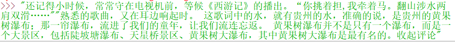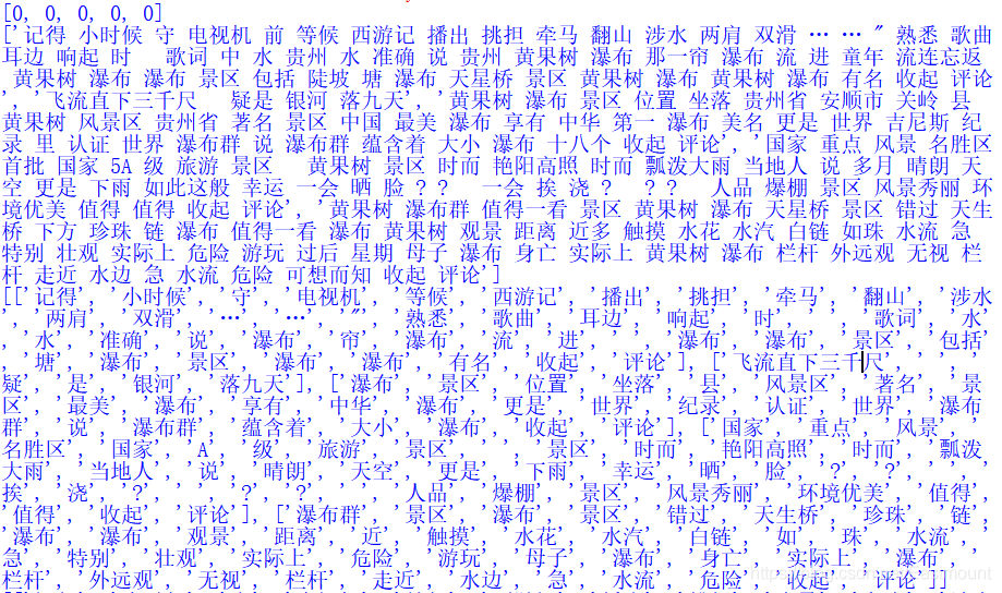 [[\'景色\', \' \', \'景区\', \'太\', \'成熟\', \'从\', \'大\', \'瀑布\', \'景区\', \'出发\', \'景区\', \'观光车\', \'足足\', \'游客\', \'半小时\', \'世博会\', \'路上\', \'摩肩接踵\', \'欣赏\', \'美景\', \'心情\', \'观光车\', \'上车\', \'处\', \'标明\', \'目的地\', \'入口处\', \'引导\', \'走\', \'冤枉路\', \'稀里糊涂\', \'上车\', \'问\', \'司机\', \'到达\', \'司机\', \'含糊地\', \'说\', \'开出\', \'景区\', \'客运站\', \'七孔\', \'景区\', \'开发\', \'完美\', \'收起\', \'评论\'], [\'淡季\', \'瀑布\', \'人\', \'少\', \'景美\', \'机票\', \'便宜\', \'值得\', \'去\'], [\'瀑布\', \'体验\', \'差\', \'五星\', \'好评\', \'全\', \'是\', \'刷\', \'道路\', \'很窄\', \'导致\', \'大面积\', \'堵塞\', \'排队\', \'崩溃\', \'景区\', \'指引\', \'清晰\', \'排队\', \'大雨\', \'遮雨\', \'设计\', \'搞\', \'大人\', \'小孩\', \'老人\', \'淋雨\', \'景区\', \'接待\', \'能力差\', \'瀑布\', \'真的\', \'徒有虚名\', \'七孔\', \'收起\', \'评论\'], [\'老爸\', \'分\', \'瀑布\', \'瀑布\', \'瀑布\', \'游览\', \'瀑布\', \'门票\', \'反正\', \'超过\', \' \', \'来到\', \'熟悉\', \'告知\', \'只能\', \'出\', \'进入\', \'口\', \'回到\', \'高速\', \'出口\', \'直行\', \'回去\', \'倒\', \'指示\', \'清晰\', \'隔离\', \'栏杆\', \'自驾车\', \'导进\', \'停车场\', \'停车场\', \'收费\', \'且\', \'时间\', \' \', \'停车场\', \'经查\', \'景区\', \'门票\', \'单人\', \'含\', \'交通\', \'车费\', \'交通车\', \'需\', \'另付\', \'从外\', \'围绕\', \'路\', \'花\', \'不到\', \'分钟\', \'车费\', \'真心\', \'接受\', \' \', \'全家人\', \'不想\', \'┐\', \'(\', \'─\', \'__\', \'─\', \')\', \'┌\', \'利益\', \'勾结\', \'剧烈\', \'涨费\', \'个金\', \'瀑布\', \'好看\', \'差\', \'评\', \' \', \'图片\', \'未\', \'开发\', \'瀑布\', \'天坑\', \'瀑布\', \'壮观\', \'壮观\', \'有\', \'灵秀\', \'景区\', \'膨胀\', \'成\', \'收起\', \'评论\'], [\'全家\', \'票\', \'居民\', \'专享\', \'优惠\', \'票\']] [1, 0, 1, 1, 1] Word2Vec(vocab=718, size=100, alpha=0.025) [[ 0 0 0 ... 2481 5 4] [ 0 0 0 ... 570 52 90] [ 0 0 0 ... 187 5 4] ... [ 0 0 0 ... 93 5 4] [ 0 0 0 ... 30 5 4] [ 0 0 0 ... 81 18 78]] [[0. 1.] [1. 0.] [0. 1.] [0. 1.] [0. 1.] [0. 1.] [1. 0.]