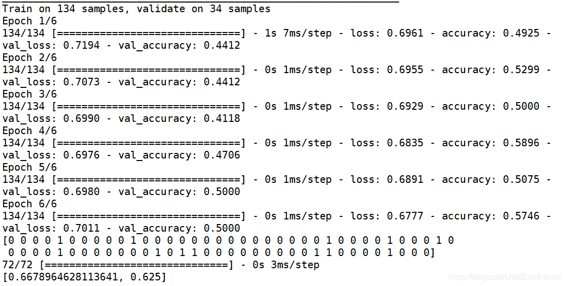 输出结果如下图所示,该模型的预测结果不是很理想,accuracy值仅为0.625,为什么呢?作者也还在进一步研究深度模型的优化,本文更重要的是提供一种可用的方法,效果不好也请见谅~