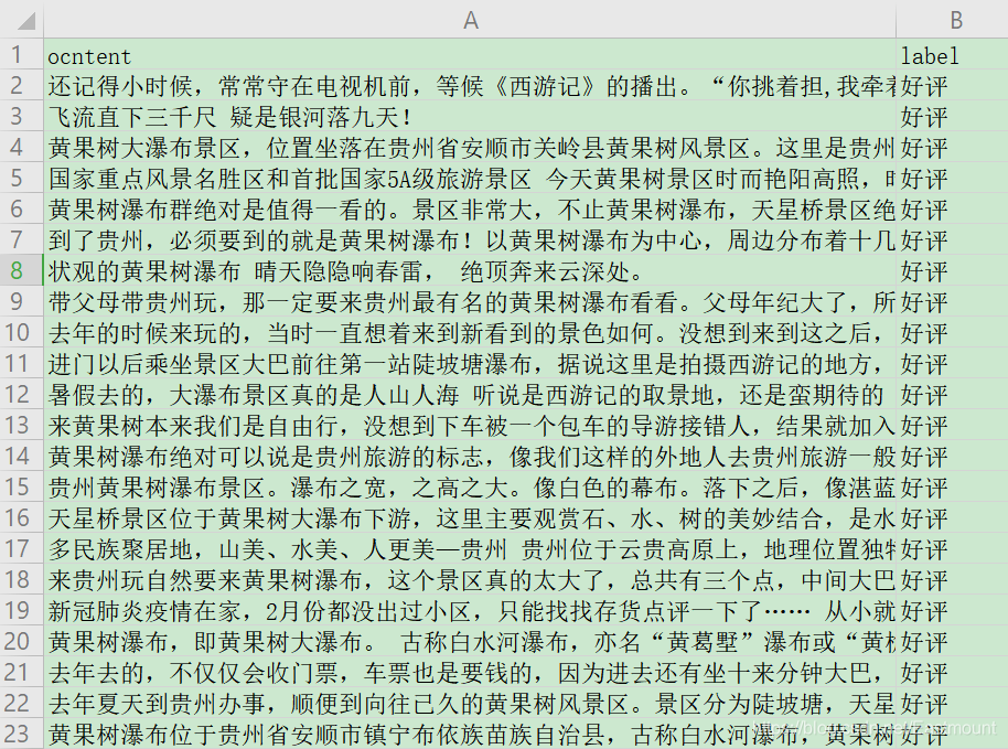 本文的数据为近期贵州黄果树瀑布的旅游评论文本,来自大众点评网,共有240条数据,其中差评数据114条,好评数据126条,如下图所示: