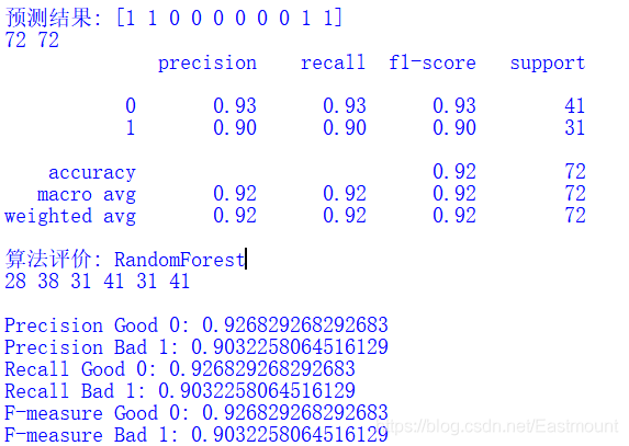 随机森林分类 precision recall f1-score support 0 0.92 0.88 0.90 41 1 0.85 0.90 0.88 31 accuracy 0.89 72 macro avg 0.89 0.89 0.89 72 weighted avg 0.89 0.89 0.89 72 算法评价: RandomForest 28 36 33 39 31 41 Precision Good 0:0.9231 Precision Bad 1:0.8485 Avg_precision:0.8858 Recall Good 0:0.8780 Recall Bad 1:0.9032 Avg_recall:0.8906 F-measure Good 0:0.9000 F-measure Bad 1:0.8750 Avg_fmeasure:0.8875 决策树分类 precision recall f1-score support 0 0.81 0.73 0.77 41 1 0.69 0.77 0.73 31 accuracy 0.75 72 macro avg 0.75 0.75 0.75 72 weighted avg 0.76 0.75 0.75 72 算法评价: DecisionTree 24 30 35 37 31 41 Precision Good 0:0.8108 Precision Bad 1:0.6857 Avg_precision:0.7483 Recall Good 0:0.7317 Recall Bad 1:0.7742 Avg_recall:0.7530 F-measure Good 0:0.7692 F-measure Bad 1:0.7273 Avg_fmeasure:0.7483 支持向量机分类 最近邻分类 朴素贝叶斯分类 逻辑回归分类 ......