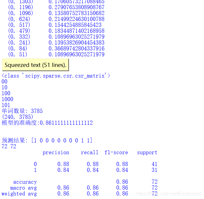 # -*- coding:utf-8 -*- import csv import numpy as np import jieba import jieba.analyse from sklearn import feature_extraction from sklearn.feature_extraction.text import TfidfVectorizer from sklearn.feature_extraction.text import CountVectorizer from sklearn.feature_extraction.text import TfidfTransformer from sklearn.model_selection import train_test_split from sklearn.metrics import classification_report from sklearn.ensemble import RandomForestClassifier #----------------------------------第一步 读取文件-------------------------------- file = "data.csv" with open(file, "r", encoding="UTF-8") as f: # 使用csv.DictReader读取文件中的信息 reader = csv.DictReader(f) labels = [] contents = [] for row in reader: # 数据元素获取 if row[\'label\'] == \'好评\': res = 0 else: res = 1 labels.append(res) content = row[\'content\'] seglist = jieba.cut(content,cut_all=False) #精确模式 output = \' \'.join(list(seglist)) #空格拼接 #print(output) contents.append(output) print(labels[:5]) print(contents[:5]) #----------------------------------第二步 数据预处理-------------------------------- # 将文本中的词语转换为词频矩阵 矩阵元素a[i][j] 表示j词在i类文本下的词频 vectorizer = CountVectorizer() # 该类会统计每个词语的tf-idf权值 transformer = TfidfTransformer() #第一个fit_transform是计算tf-idf 第二个fit_transform是将文本转为词频矩阵 tfidf = transformer.fit_transform(vectorizer.fit_transform(contents)) for n in tfidf[:5]: print(n) #tfidf = tfidf.astype(np.float32) print(type(tfidf)) # 获取词袋模型中的所有词语 word = vectorizer.get_feature_names() for n in word[:5]: print(n) print("单词数量:", len(word)) # 将tf-idf矩阵抽取出来,元素w[i][j]表示j词在i类文本中的tf-idf权重 X = tfidf.toarray() print(X.shape) # 使用 train_test_split 分割 X y 列表 # X_train矩阵的数目对应 y_train列表的数目(一一对应) -->> 用来训练模型 # X_test矩阵的数目对应 (一一对应) -->> 用来测试模型的准确性 X_train, X_test, y_train, y_test = train_test_split(X, labels, test_size=0.3, random_state=1) #----------------------------------第三步 机器学习分类-------------------------------- # 随机森林分类方法模型 # n_estimators:森林中树的数量 clf = RandomForestClassifier(n_estimators=20) # 训练模型 clf.fit(X_train, y_train) # 使用测试值 对 模型的准确度进行计算 print(\'模型的准确度:{}\'.format(clf.score(X_test, y_test))) print("\n") # 预测结果 pre = clf.predict(X_test) print(\'预测结果:\', pre[:10]) print(len(pre), len(y_test)) print(classification_report(y_test, pre))