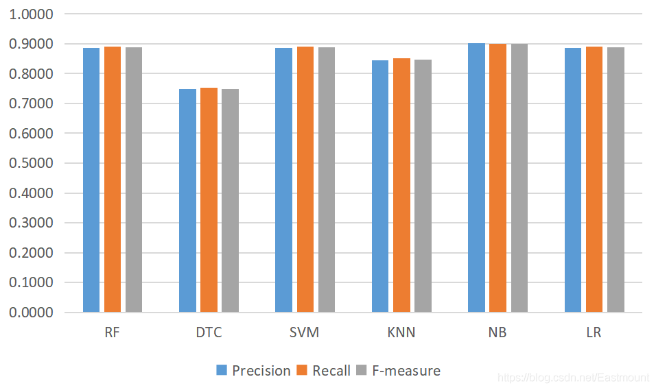 最后作者给出机器学习RF、DTC、SVM、KNN、NB、LR的文本分类结果,这也是写论文中很常见的操作。
