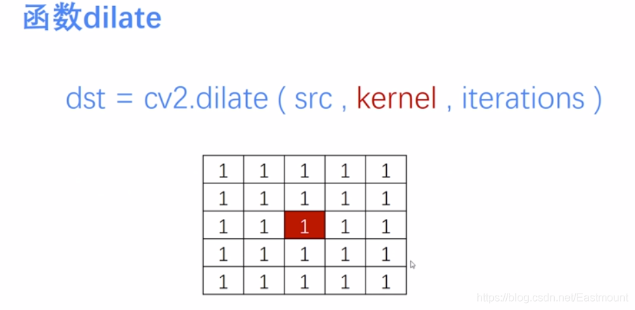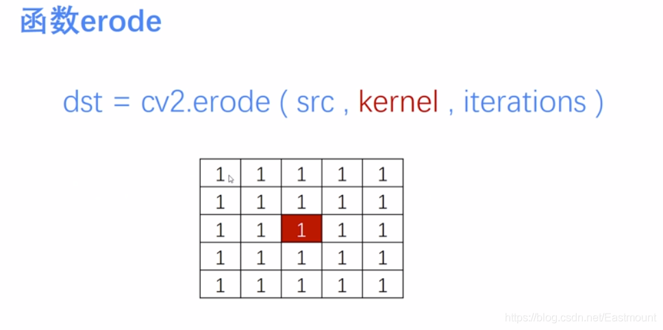 参数dst表示处理的结果,src表示原图像,kernel表示卷积核,iterations表示迭代次数。下图表示5*5的卷积核,可以采用函数 np.ones((5,5), np.uint8) 构建。
