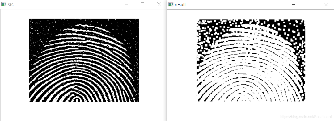 #encoding:utf-8 import cv2 import numpy as np #读取图片 src = cv2.imread('test01.jpg', cv2.IMREAD_UNCHANGED) #设置卷积核 kernel = np.ones((5,5), np.uint8) #图像腐蚀处理 erosion = cv2.erode(src, kernel) #显示图像 cv2.imshow("src", src) cv2.imshow("result", erosion) #等待显示 cv2.waitKey(0) cv2.destroyAllWindows()