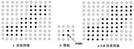 该公式表示图像A用卷积模板B来进行腐蚀处理,通过模板B与图像A进行卷积计算,得出B覆盖区域的像素点最小值,并用这个最小值来替代参考点的像素值。如图所示,将左边的原始图像A腐蚀处理为右边的效果图A-B。
