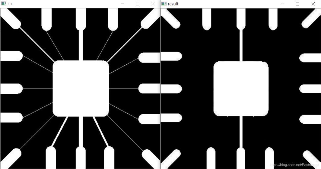 #encoding:utf-8 import cv2 import numpy as np #读取图片 src = cv2.imread('test02.png', cv2.IMREAD_UNCHANGED) #设置卷积核 kernel = np.ones((5,5), np.uint8) #图像膨胀处理 erosion = cv2.dilate(src, kernel) #显示图像 cv2.imshow("src", src) cv2.imshow("result", erosion) #等待显示 cv2.waitKey(0) cv2.destroyAllWindows()