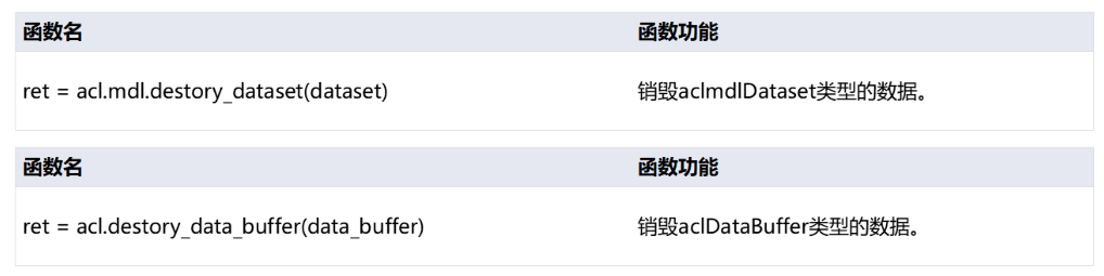 acl.create_data_buffer-> acl.destory_data_buffer; acl.mdl.create_dataset-> acl.mdl.destroy_dataset